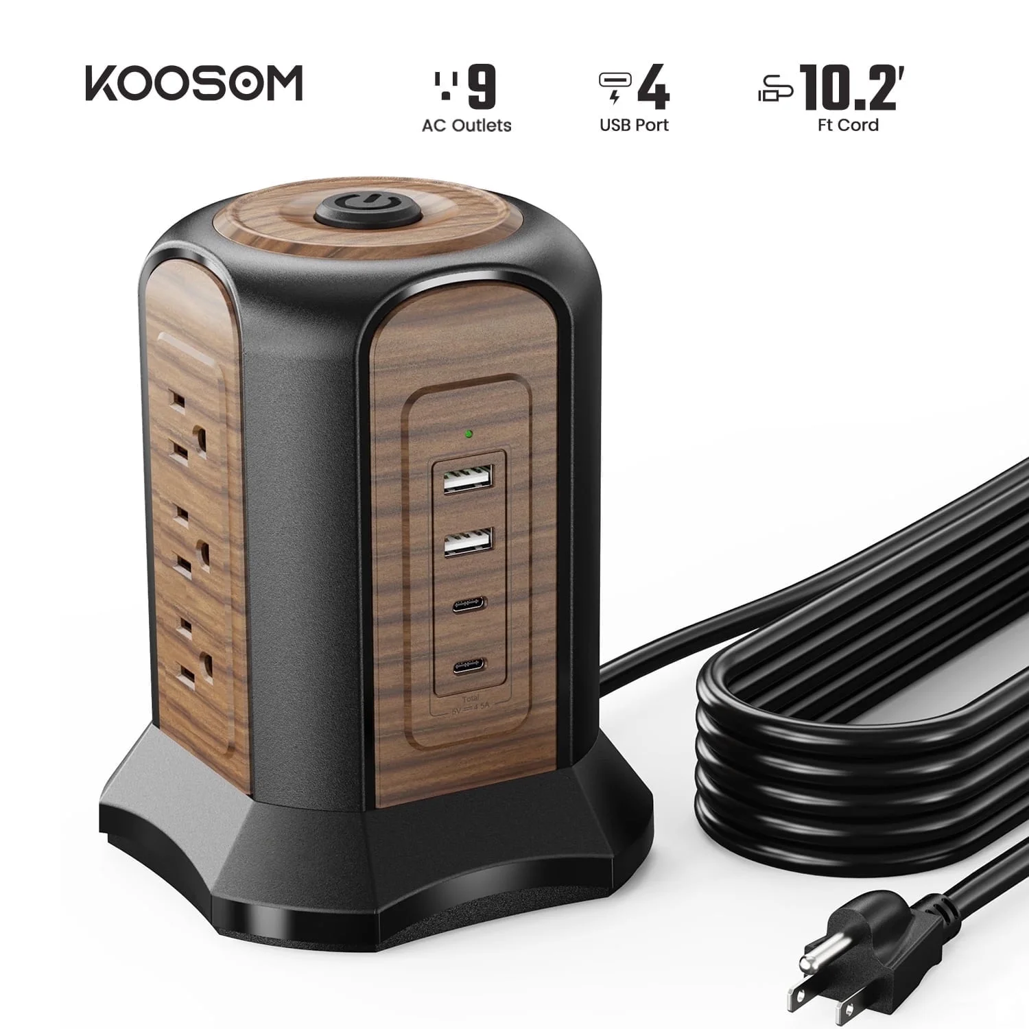 Koosom Power Strip Tower Surge Protector, 10.2 Ft Extension Cord with Multiple Outlets, 9 Outlets, 4 USB Ports (2 USB C), 1080 Joules, 3-Prong, Grounded, Charging Station for Home, Office, Brown