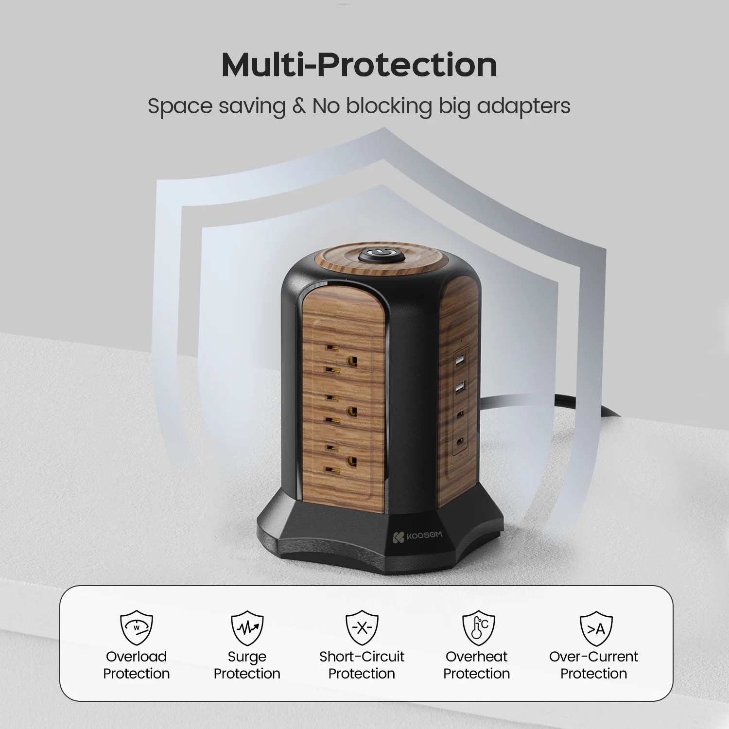 KOOSOM Power Strip Tower Surge Protector, 10.2 Ft Extension Cord with Multiple Outlets, 9 Outlets, 4 USB Ports (2 USB C), 1080 Joules, 3-Prong, Grounded, Deep Walnut