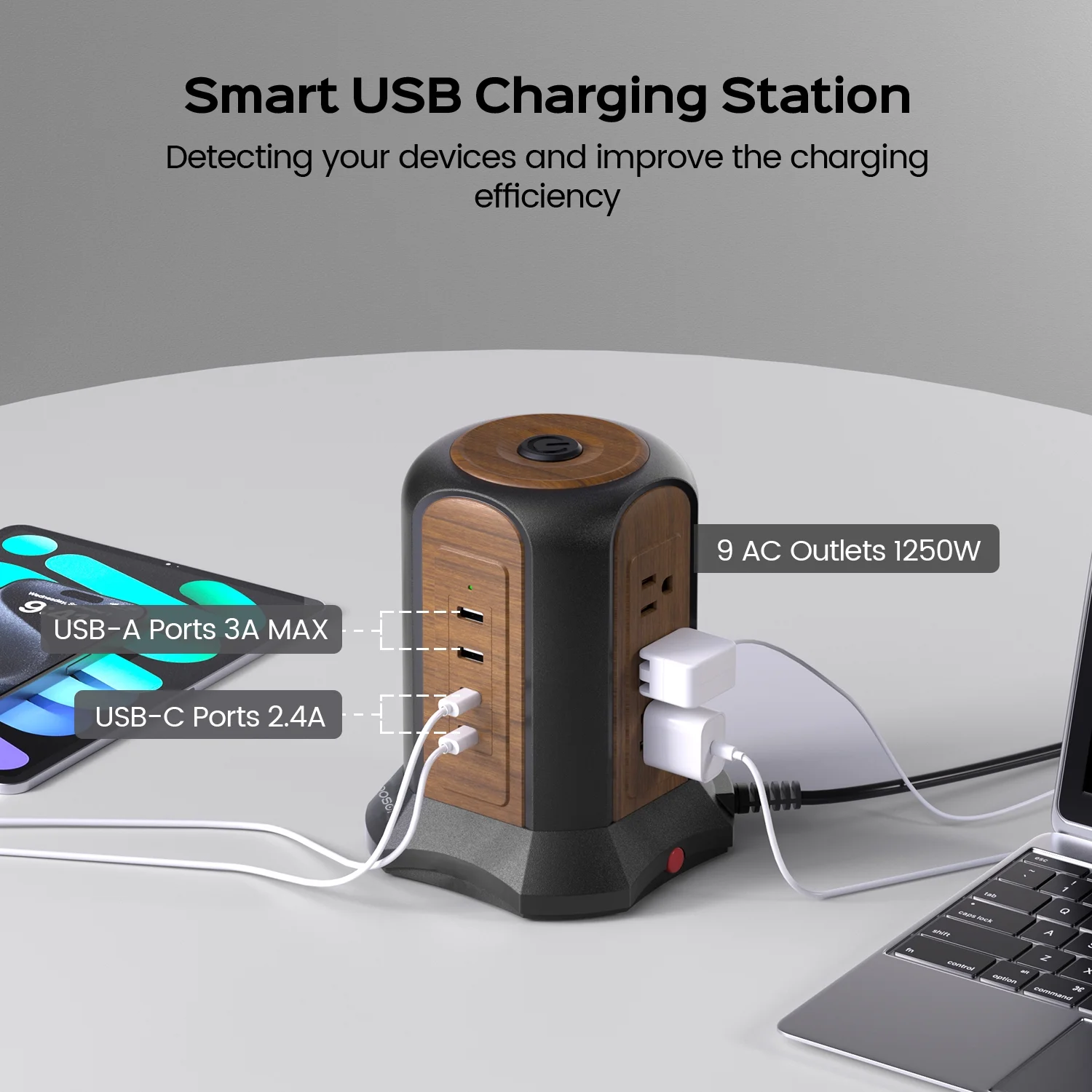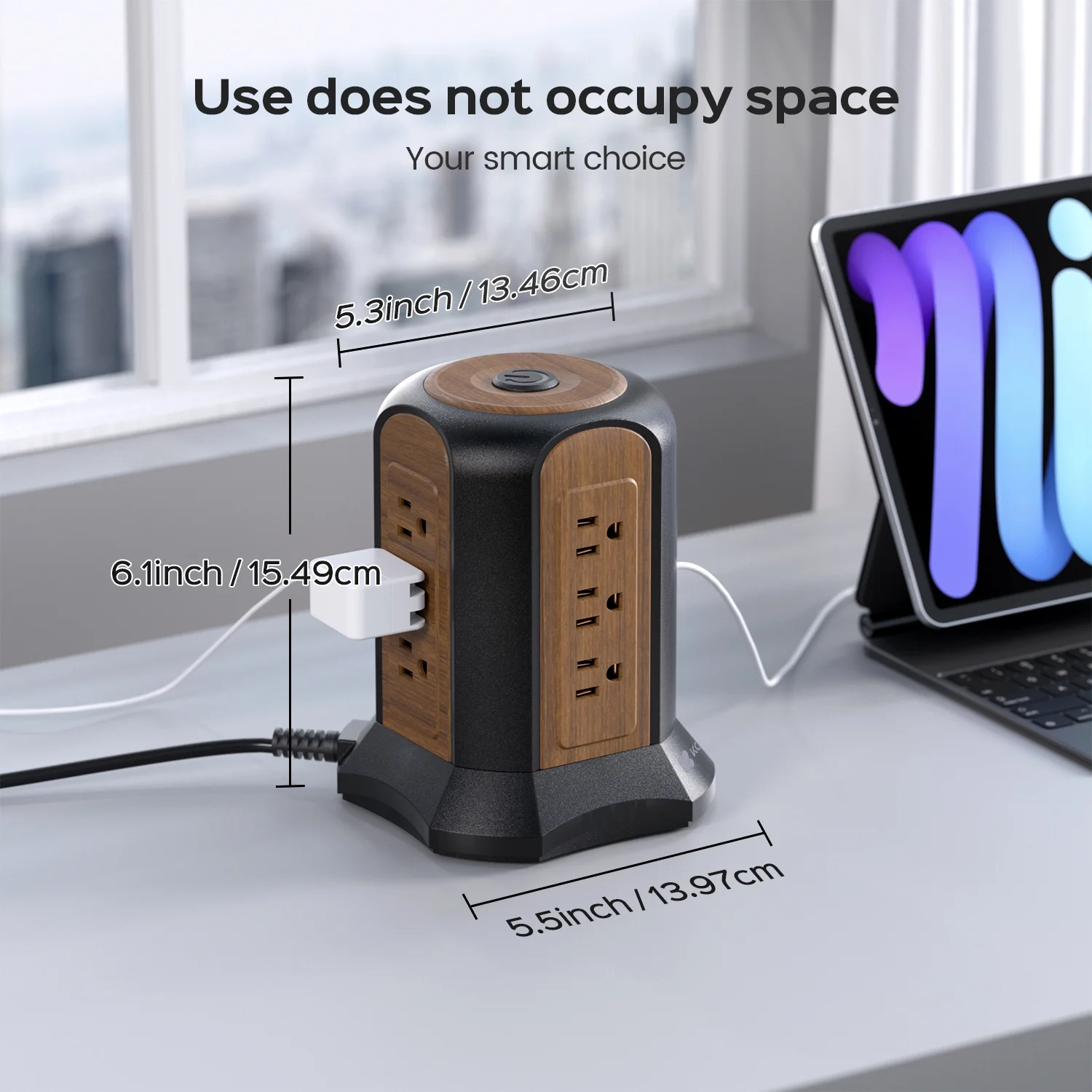 - 【VERTICAL DESIGN SAVES SPACE】-This compact surge protector tower power outlet has 4 USB ports and 9 AC outlets, expanding 1 wall outlet to 13 without taking up too much space. This perfect power outlet will keep your desktop tidy and free of those messy cords.