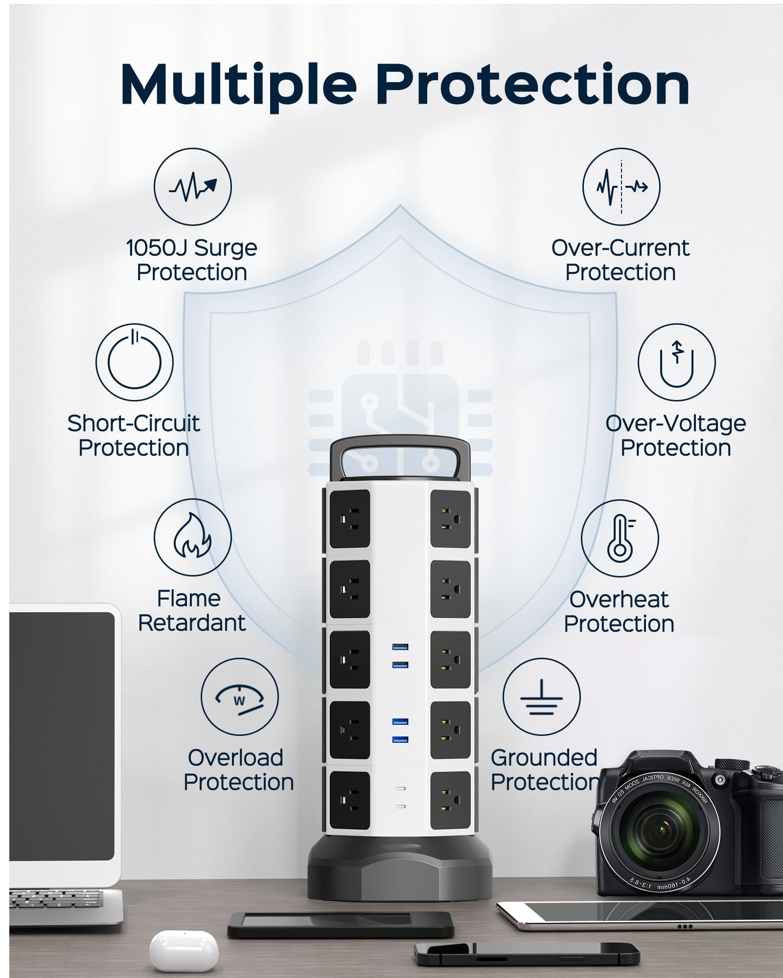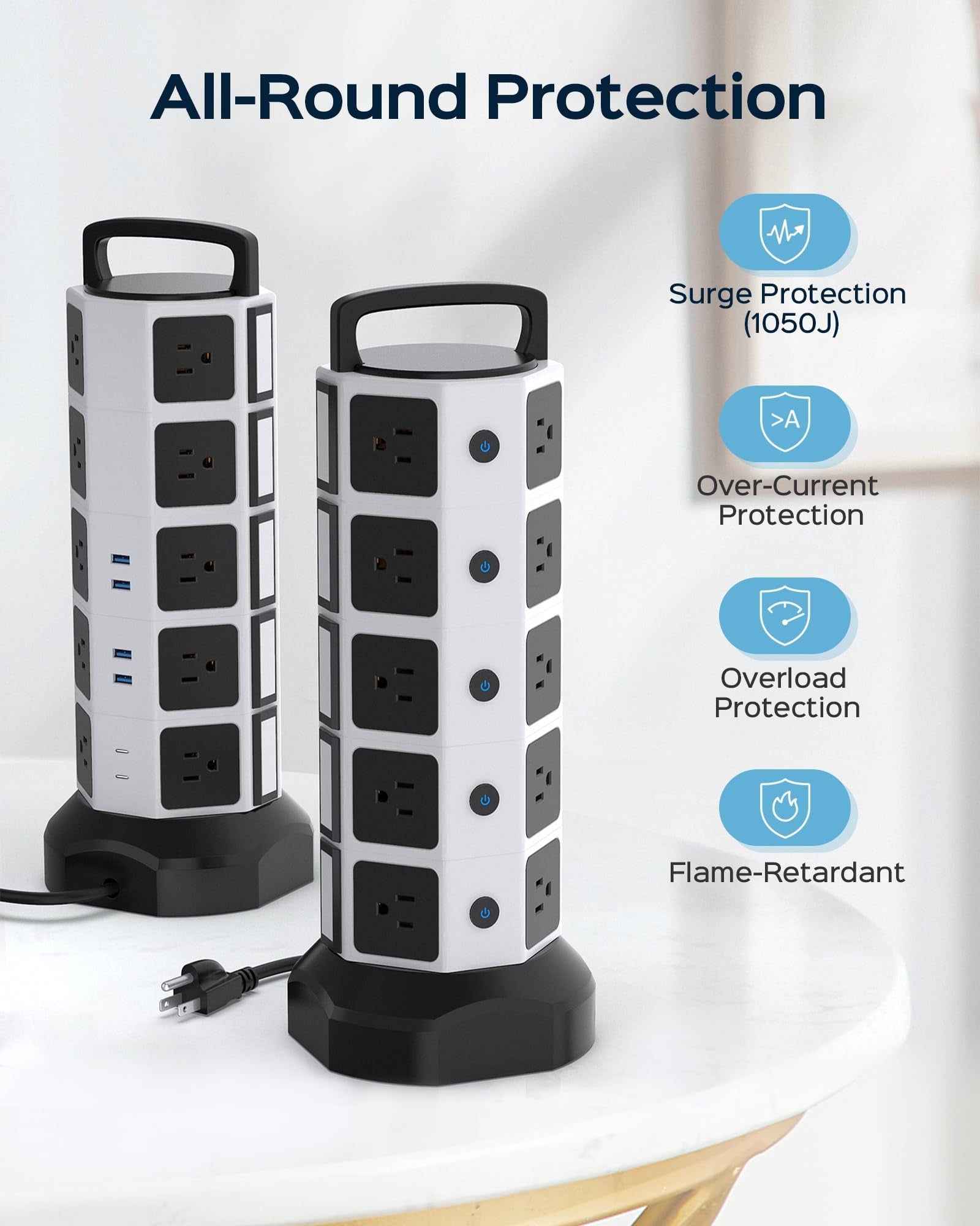 - 【Energy Saving and Space Saving】An independent switch is designed on each layer of this power strip with usb ports for you to manage the power of every device you plug in, especially those having on switch on them; efficient in power management with indicator inside switch to check its working status, saving those unnecessary waste of electricity. Besides, the vertical tower design of the power tower helps you save space, and keep your desk neat and tidy.