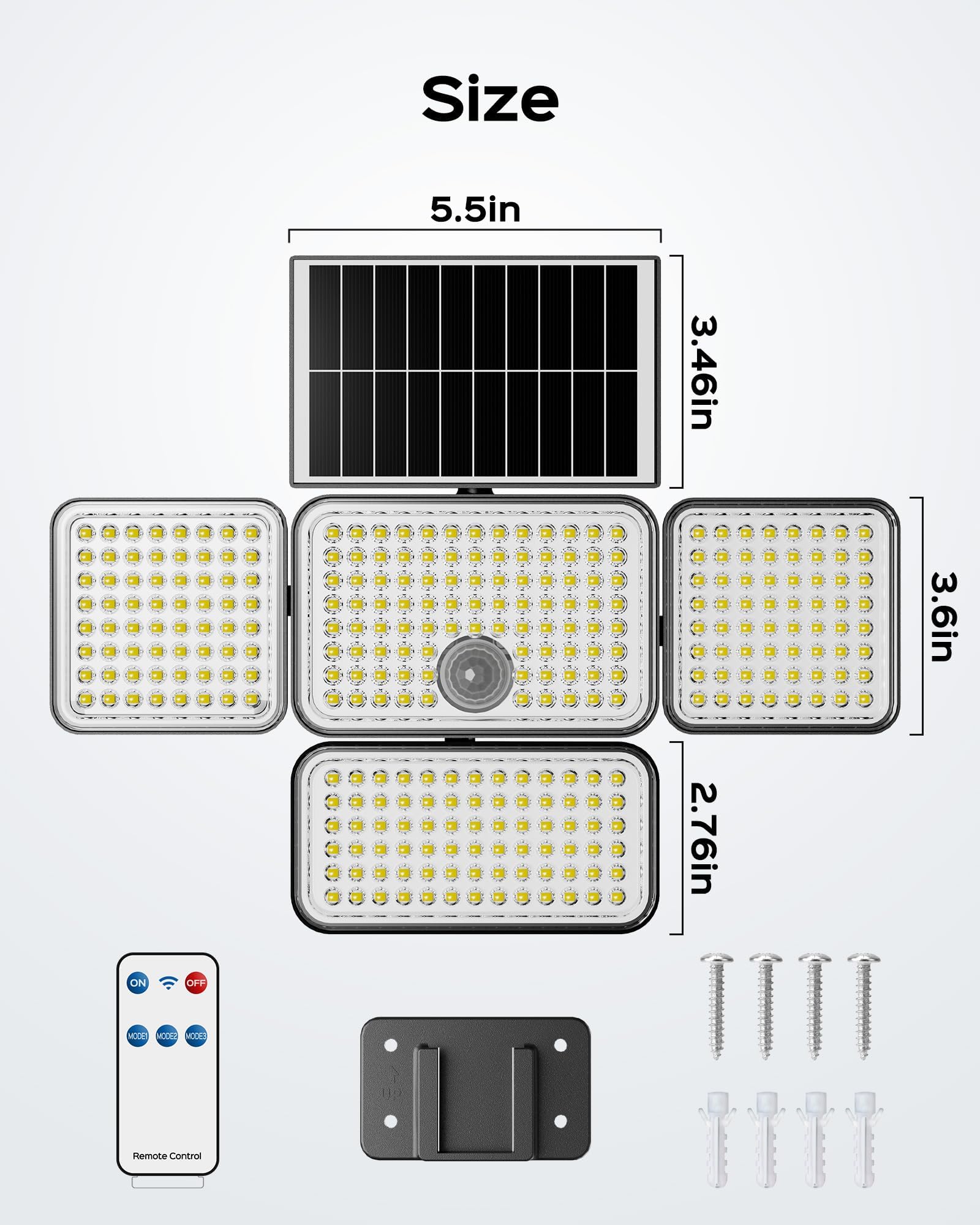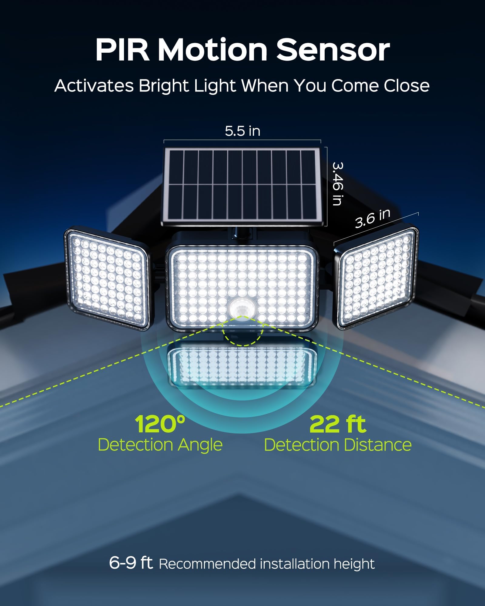 - [ 4 Adjustable Heads with 270° Lighting ] - 4 independent light heads for the solar motion lights can be adjusted to any direction, covering a max 270-degree angle and 377 sq.ft area with bright light. It’s especially useful for lighting around the corners to create a safer outdoor ambience with no dark spots. The flood light heads can also be set in one direction as a super bright spotlight for your wall, backyard, garage, and front door to make a safer environment.