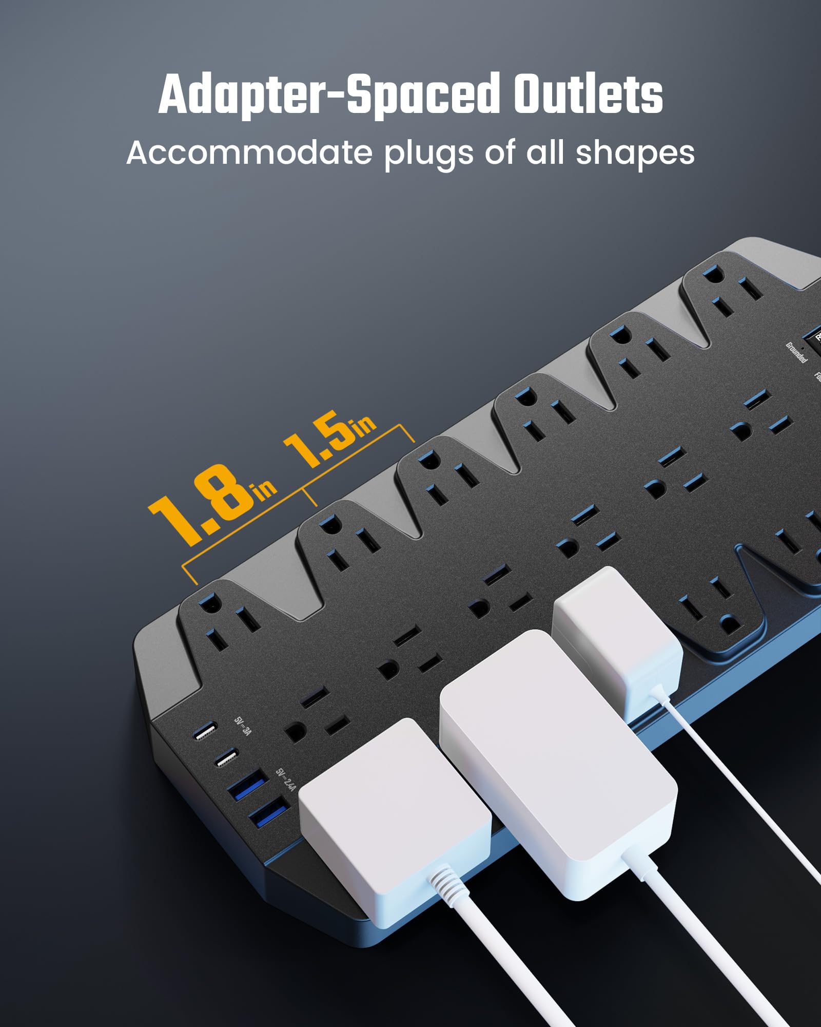 - Super-Spaced Outlets: The outlets are equipped with an extra-large space (1.5/1.8 inches) between them, accommodating the largest plugs or adapters.