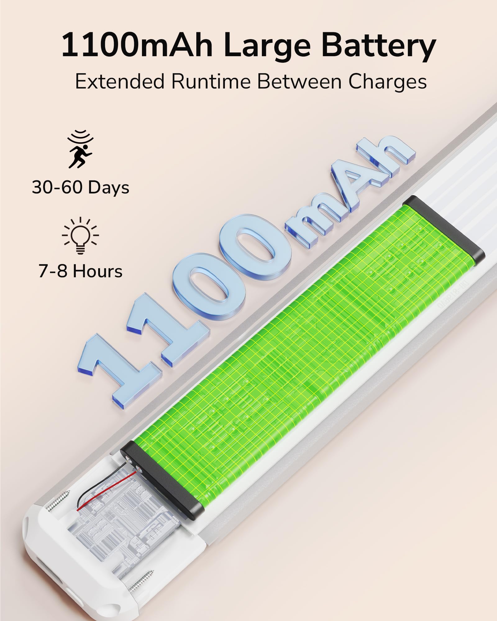 - Reduce Charging Hassles: 1100mAh under cabinet lights rechargeable features upgraded LED lighting technology to conserve battery power. Lasts 7-8 hours in constant light mode, or 30-60 days in motion sensor light mode (activate 11 times a day). USB-C charging cable is included for quick charging when you take down the cabinet lights.
